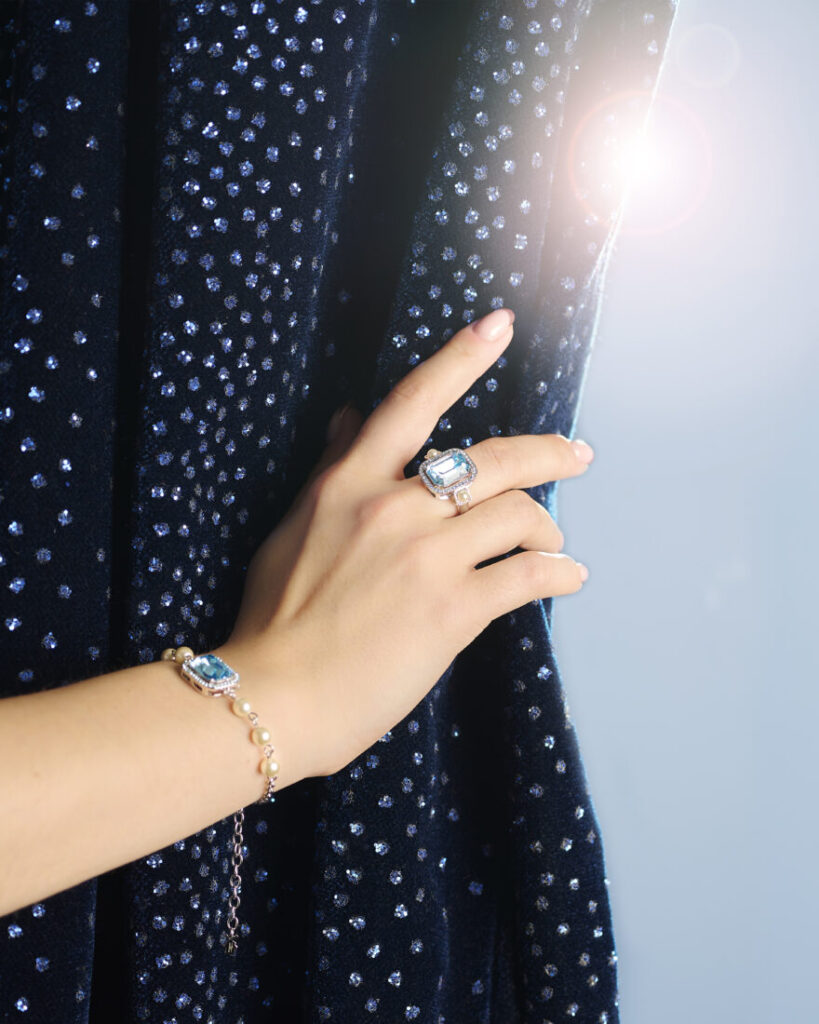 ● Grande bague Aqua : Un modèle majestueux, plus imposant, mais tout aussi raffiné que la bague fine, mêlant le charme sobre de l’argenté à l’éclat de la pierre bleue.
