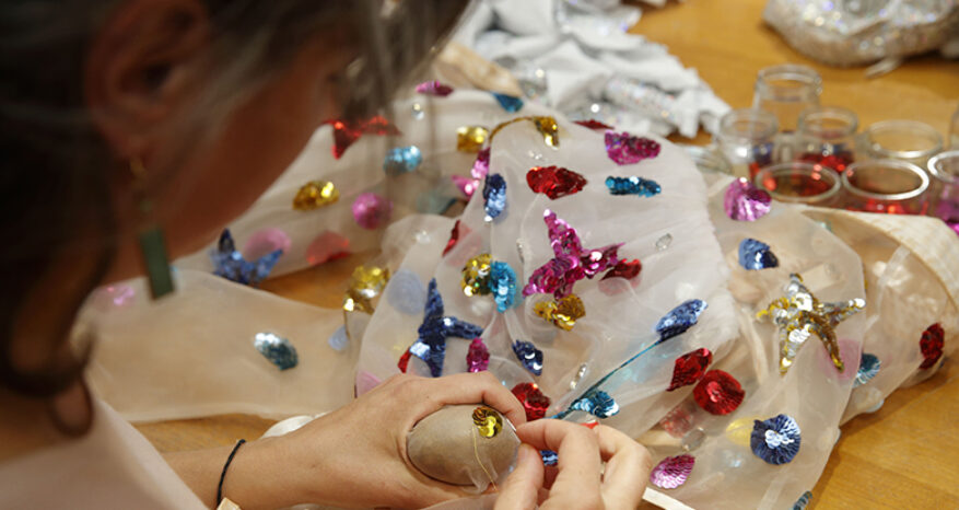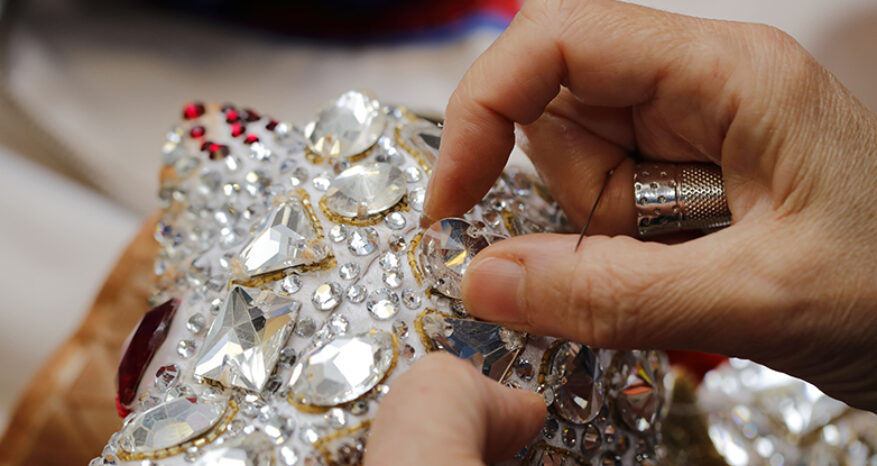 Inspirés par un croquis, les costumiers assemblent à la main étoffes, strass et paillettes avec rigueur et précision.
