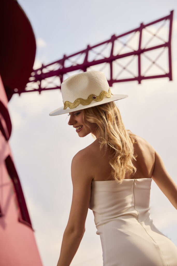 – Avec le Panama Froufrou doré, enfin, misez sur la fantaisie et l’éclatant ! Les ondulations de son ruban pailleté illumineront votre style en toute circonstance.