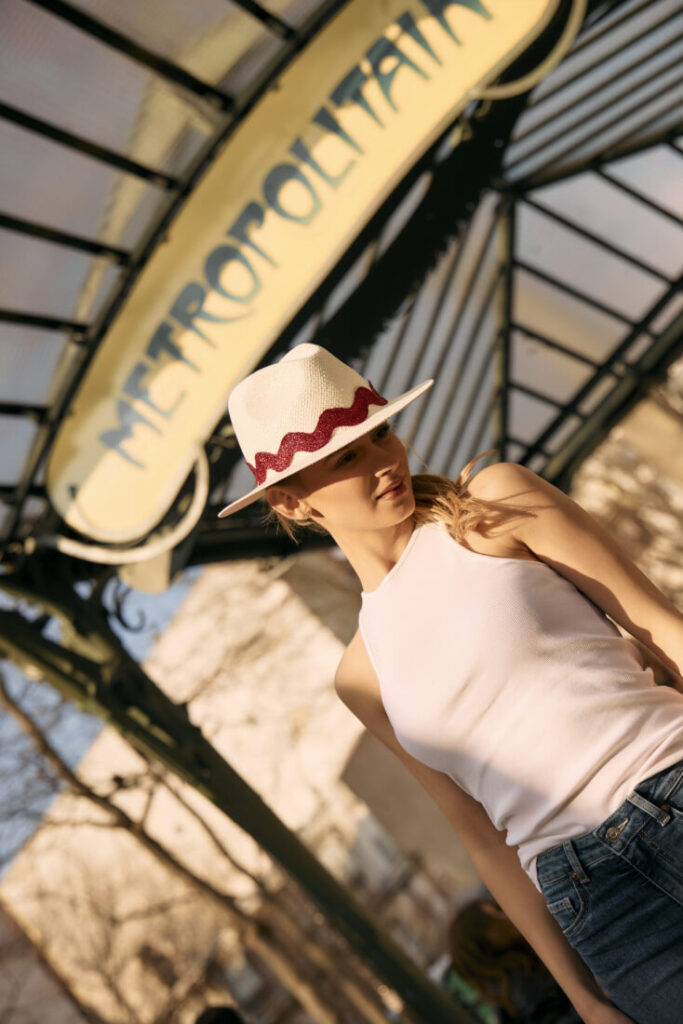 – Le Panama Froufrou rouge se pare d’un ruban « zig-zag » étincelant rappelant les ondulations des jupons des danseuses du French Cancan. De quoi donner une touche colorée à vos looks d’été !